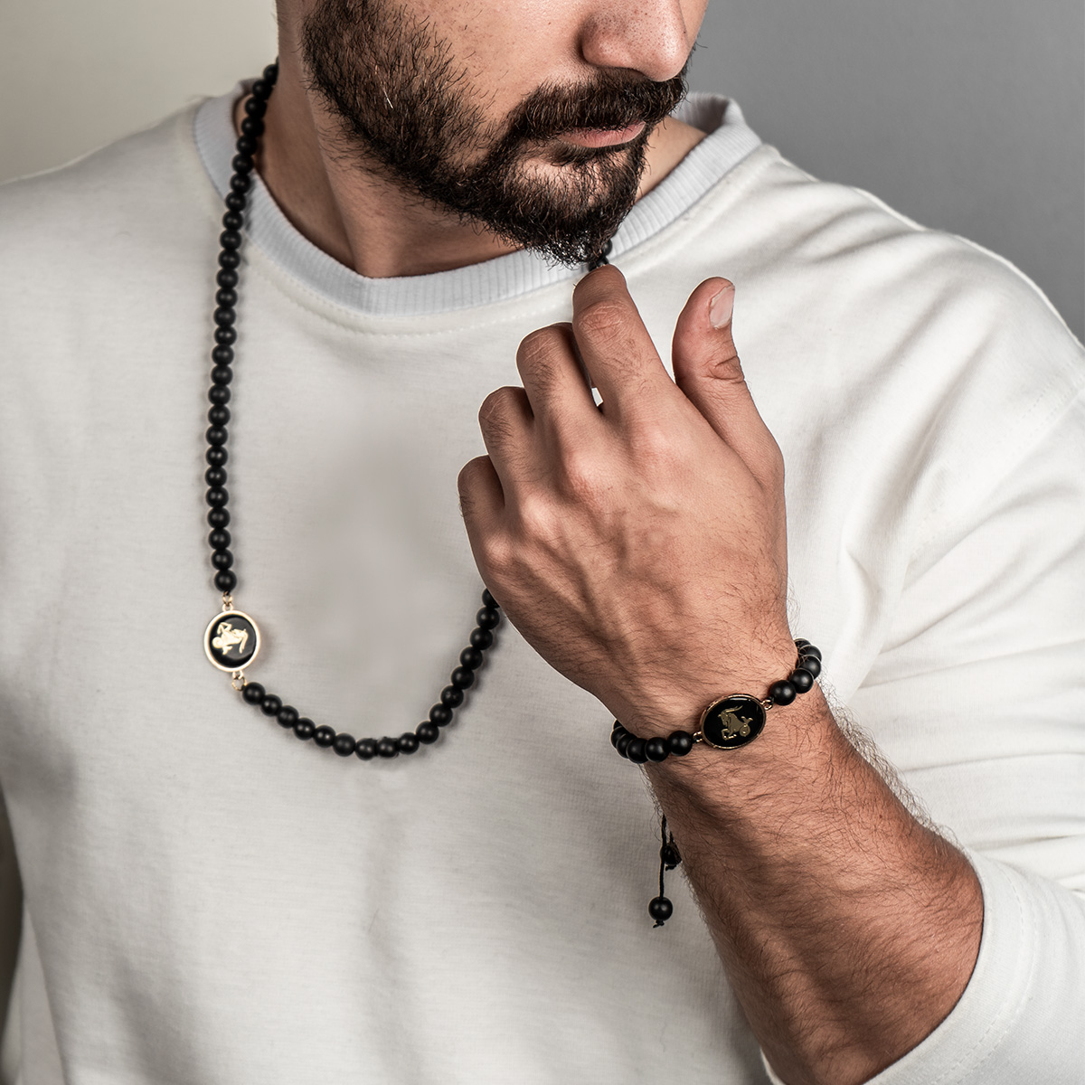 نیم ست های مهره ای مشکی از انواع گردنبندهای رو لباسی است که محبوبیت خاصی بین جوانان پیدا کرده است و جذابیت زیادی به استایل شما میدهد.طرح روی پلاک این گردنبندها نماد ماه های سال بوده و میتوانید ماه مورد نظرتان را انتخاب نمایید. قطر سنگ ها 2 میلی متر و به رنگ مشکی مات بوده و به دلیل طراحی خاص، برای استفاده روزانه و قابل ست شدن با انواع پوشش ها و مناسب برای آقایان و خانم هاست.