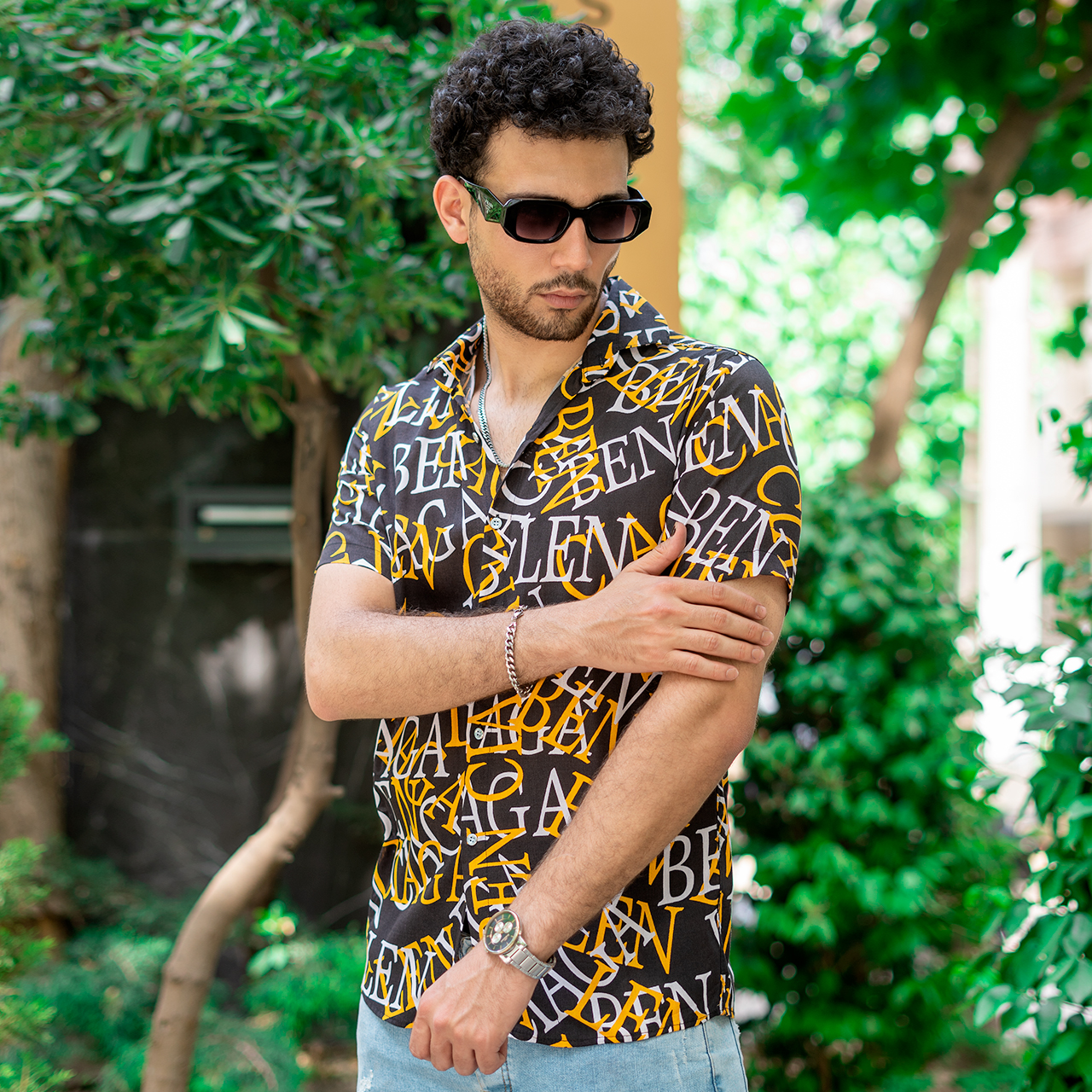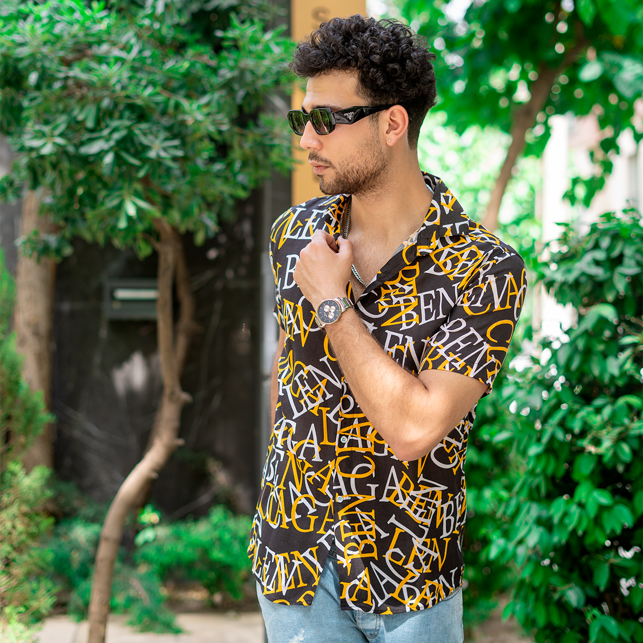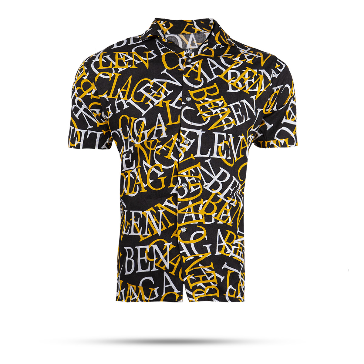 پیراهن هاوایی مردانه مشکی زرد مدل ABC