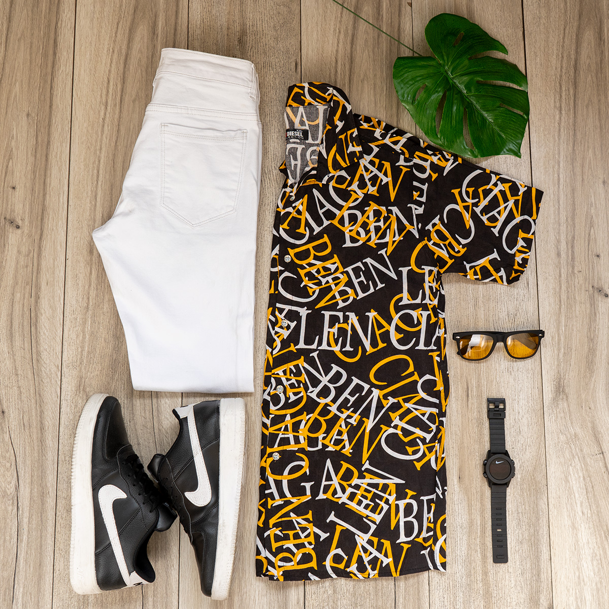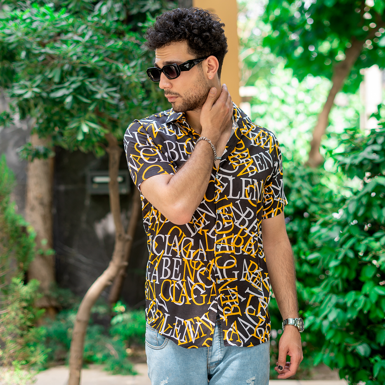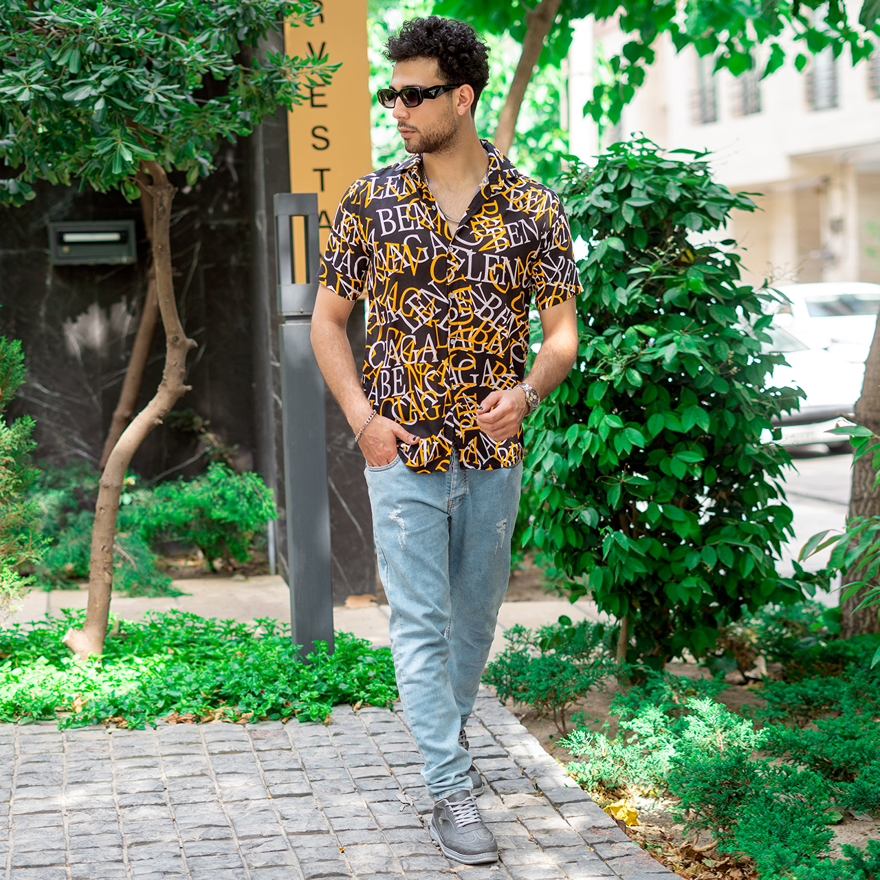 پیراهن هاوایی مردانه مشکی زرد مدل ABC