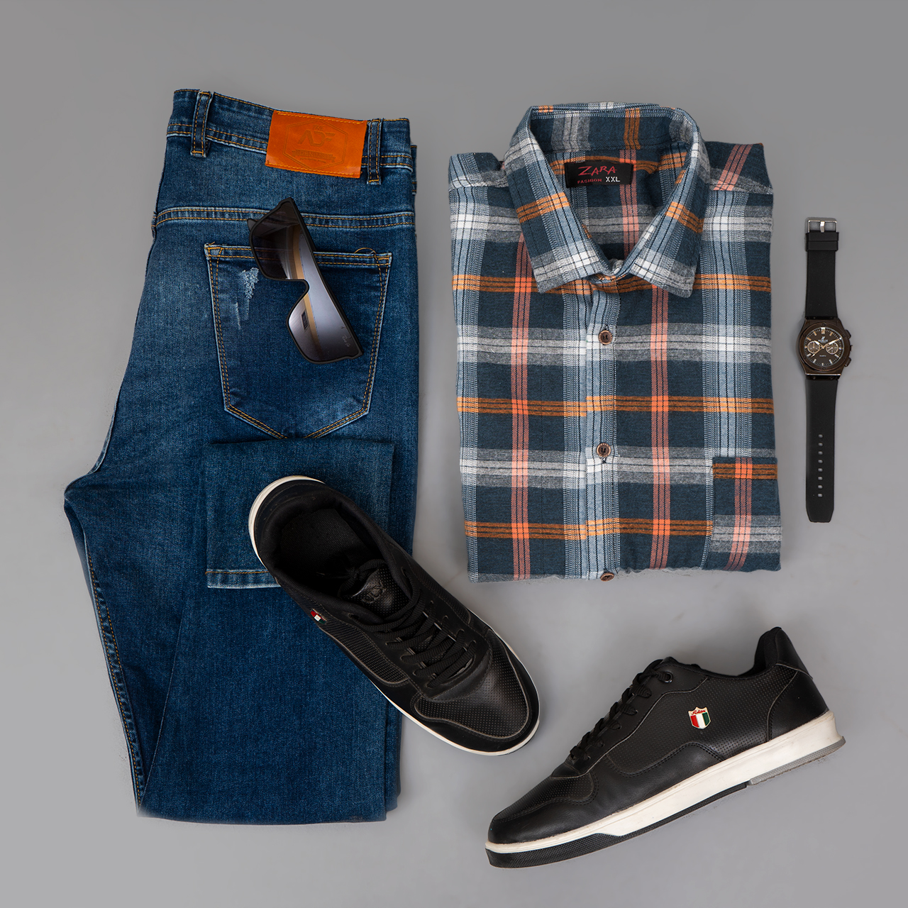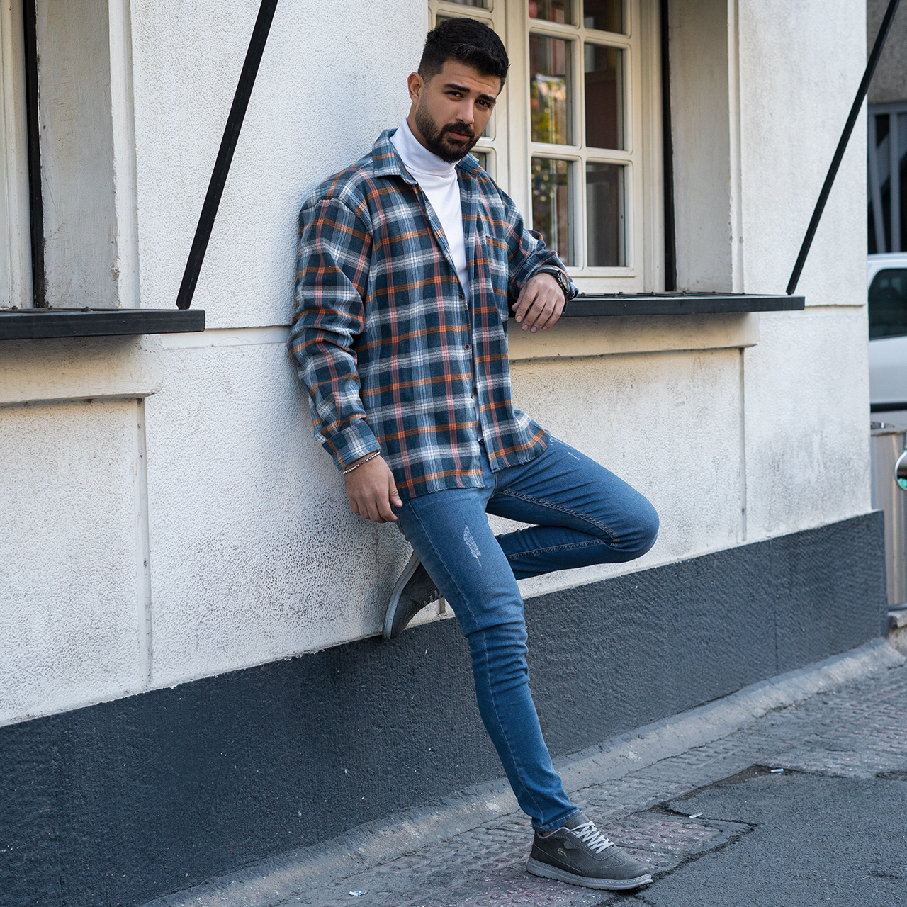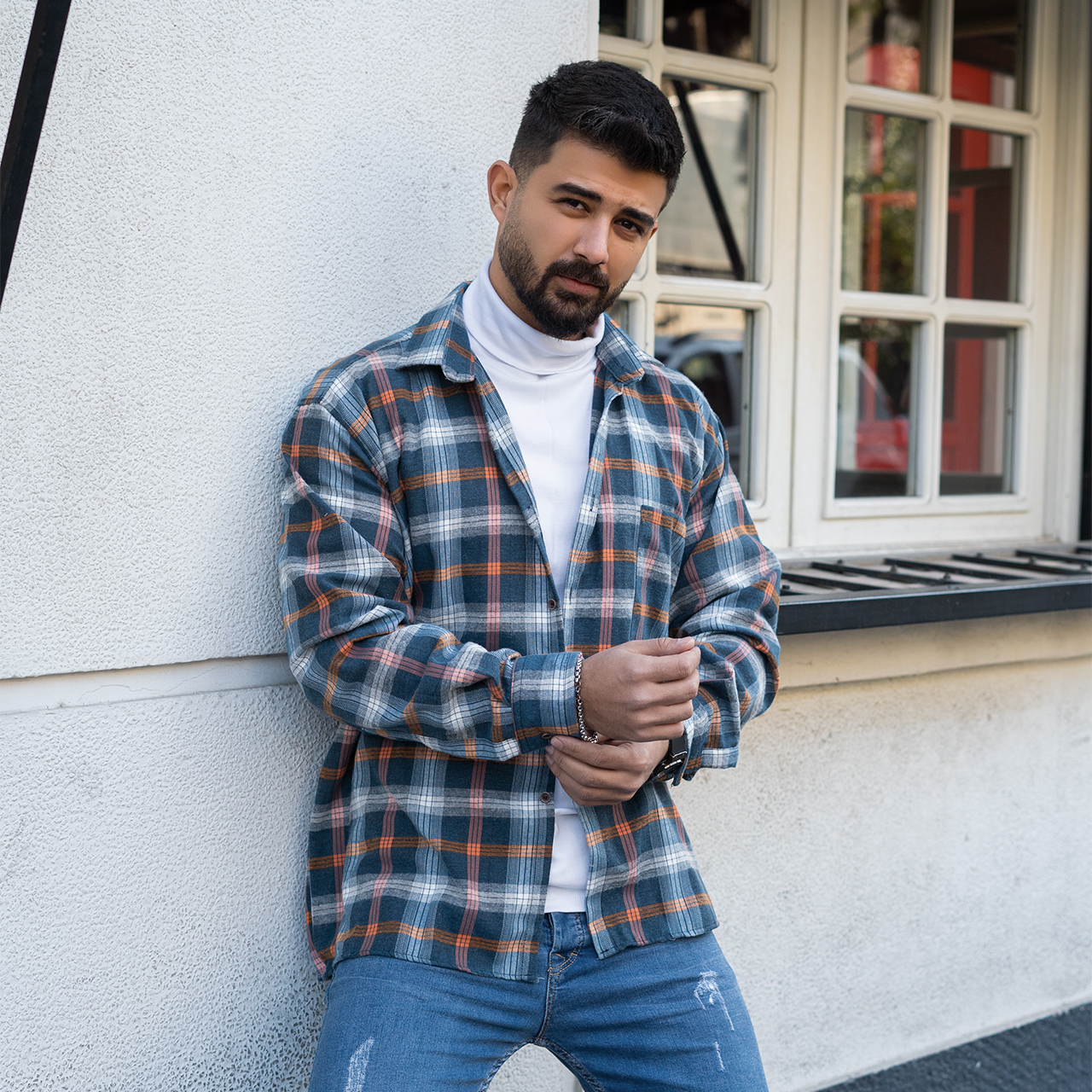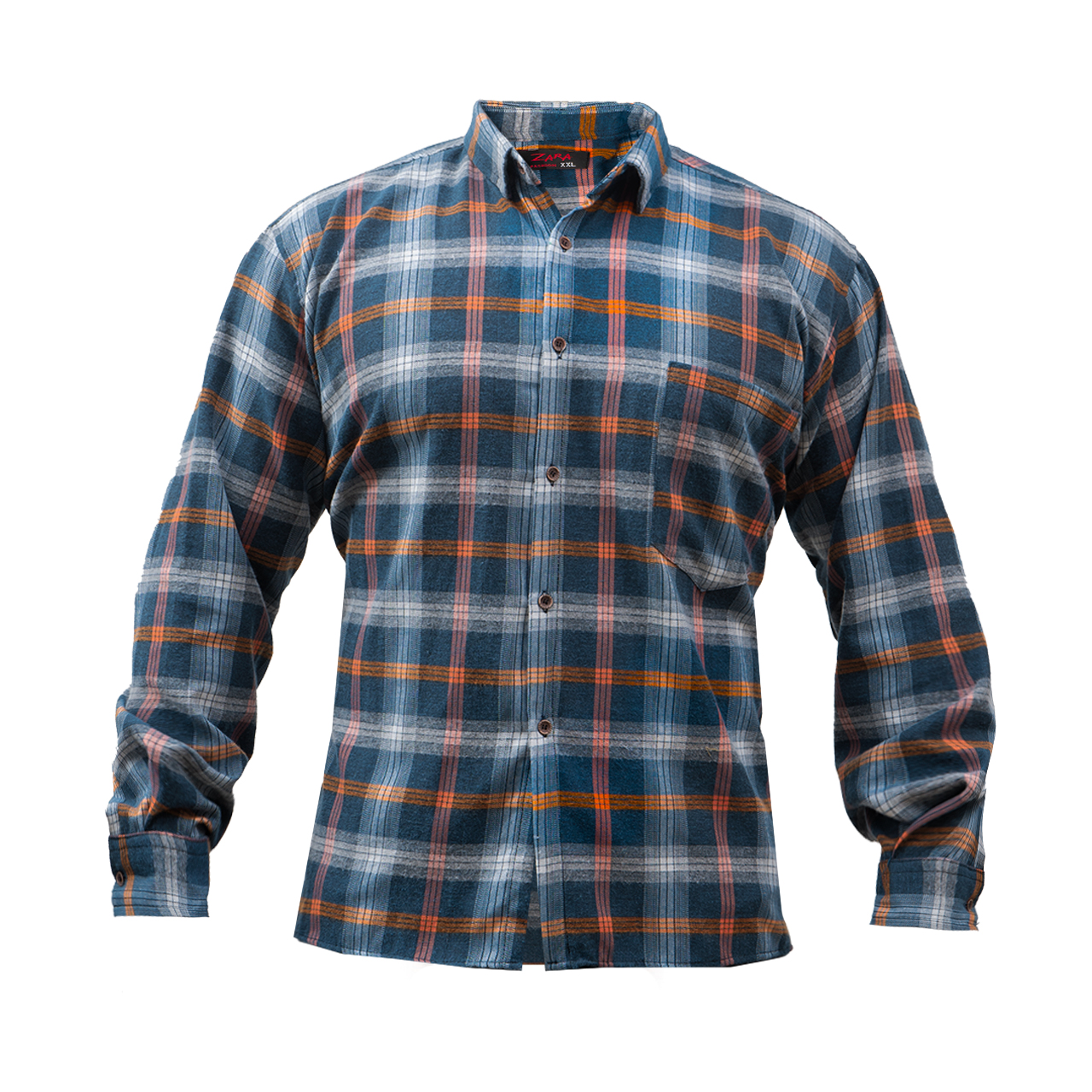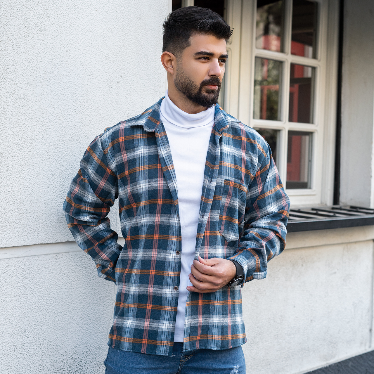 پیراهن مردانه چهارخونه آبی نارنجی مدل BEHRAD