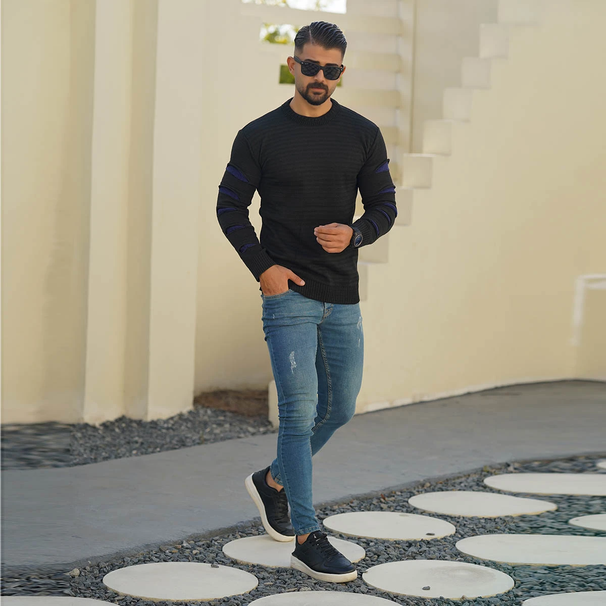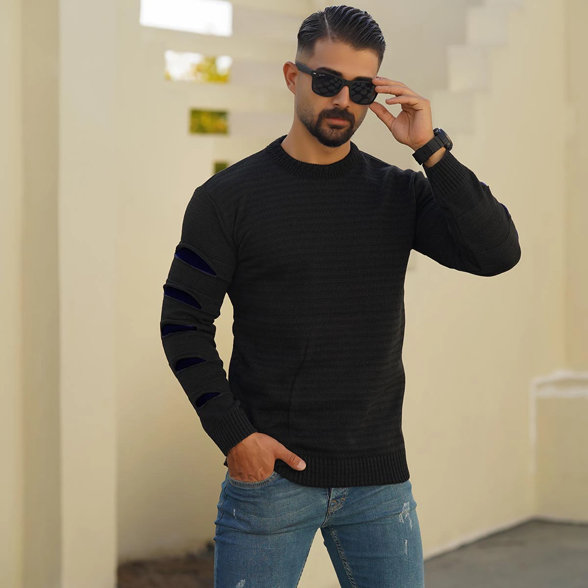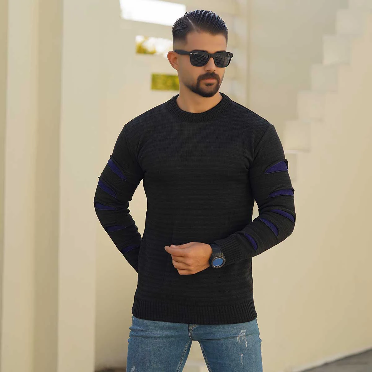 پلیور مردانه یقه گرد مشکی سرمه ای مدل Q20