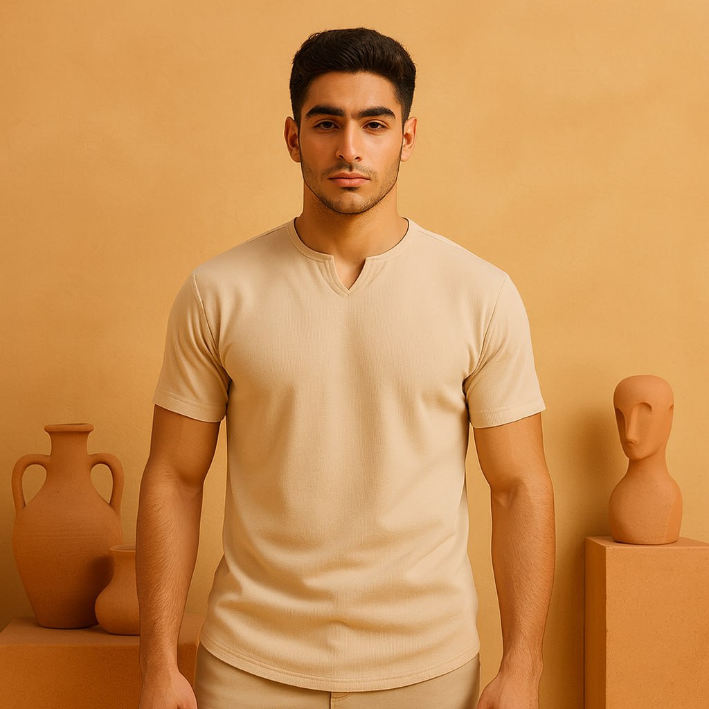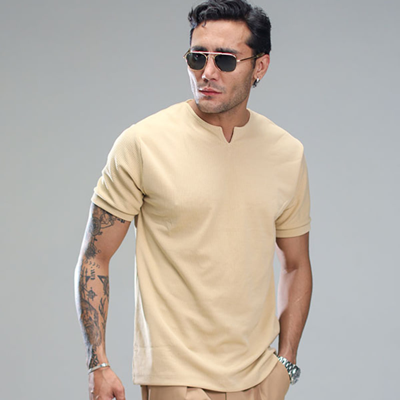 تیشرت آستین کوتاه یقه کوبایی کرم مردانه مدل Asam
